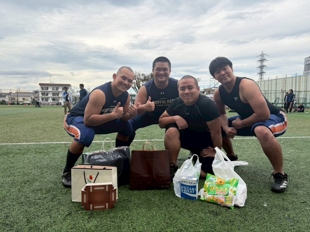 合宿という、あえて制限した環境下でアメフトに励むことは、もちろんチーム力向上にうってつけですが、精神的につらいこともついてきます。初日の終わりは、全員かなり疲れてた様子だったのにもかかわらず、次の日の夜は、ジュースを持ちながら元気に宿舎を歩く選手の姿がありました。